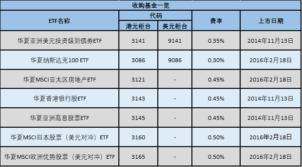 截至2021年5月25日,此7支ETF管理規模43.6億港元[5]。收購完成后華夏基金(香港)的總資產管理規模將近300億港元[6]。