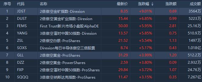 而今日漲幅居前的ETF主要有2倍做空金礦指數的JDST漲超9%,成交額3564萬美元;2倍做空黃金礦業指數的DUST漲近7%,成交額5223萬美元。