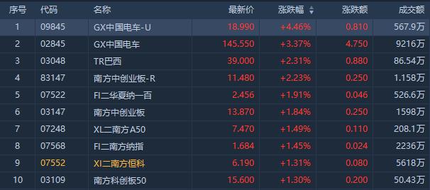 今日漲幅位居前的ETF是GX中國電車漲3.37%,成交額9216萬港元;南方中創業板-R漲2.23%。