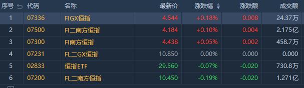 受消息影響,今日港股漲幅居前的恆指ETF有南方兩倍看空恆指(07500.HK)漲0.1%,成交額2.18億港元;