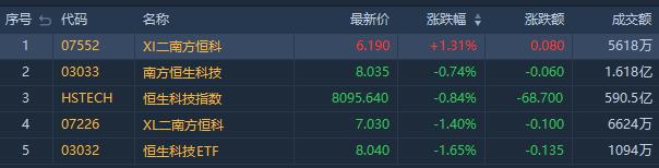 跌幅居前的是南方兩倍看多恆指(07200.HK)跌0.19%,成交額1.27億港元。