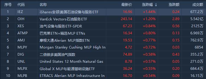 漲幅居前的有石油服務ETF漲1.2%,成交額5.54億美元;油氣設備與服務ETF漲0.84,成交額2125萬美元。