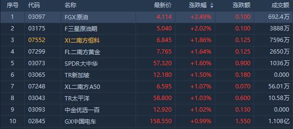 受消息影響,今日漲幅位居前的有FGX原油ETF漲2.49%,成交額692.4萬港元;三星原油期ETF漲2.02%,成交額3888萬港元。