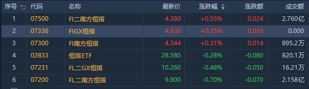 看多恆指相關ETF走弱,南方兩倍做多恆科(07226.HK)跌2.13%,成交額約1.37億港元;南方恆生科技(03033.HK)跌0.78%,成交額約2.29億港元;