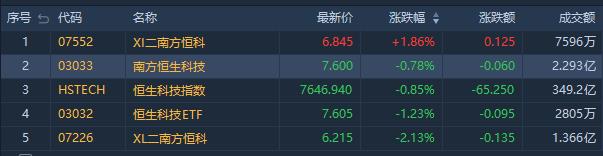 跌幅居前的是南方兩倍看多恆指(07200.HK)跌0.70%,成交額2.16億港元。