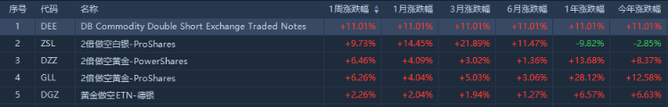 從ETF漲幅榜來看,領漲的主要是做多金融ETF。其中,$DPST Direxion每日三倍做多地區性銀行產業ETF一周累計漲15.13%;$FAS Direxion每日三倍做多金融ETF一周累漲10.76%。
