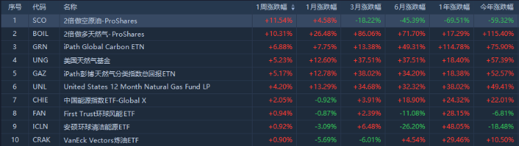 能源方面,做空原油ETF紛紛大漲。其中 $SCO 2倍做空原油ETF一周累計漲11.54%。