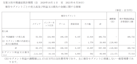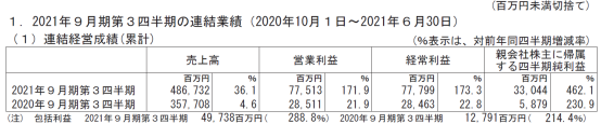 CyberAgent最新發布的2021年9月第3季度(2020.10.1-2021.6.30)財報,銷售額4867億3200萬日元,同比增長36.1%;營業利潤775億1300萬日元,同比增長171.9%;經常利潤777億9900萬日元,同比增長173.3%;歸屬股東當期純利潤330億4400萬日元,同比增長462.1%。全面大幅增收增益。