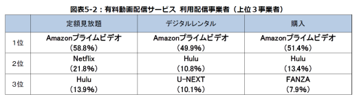 收費視頻配信服務中市場份額TOP3依舊是Amazon Prime Video、Netflix及Hulu。在被Amazon Prime Video、Netflix等外資企業獨佔鰲頭的日本定額制視頻配信服務中, Hulu和U-NEXT成爲了本土企業中的扛旗者。