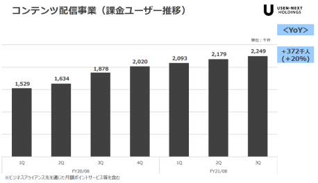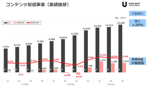從內容配信事業來看,受疫情宅家需求提升帶動,影像配信服務市場正在進一步活化,收費影像配信服務的利用率也得到提高。該季度銷售額440億5500萬日元,同比增長35.8%,營業利潤47億2300萬日元,去年同期為虧損狀態,實現大幅盈余。