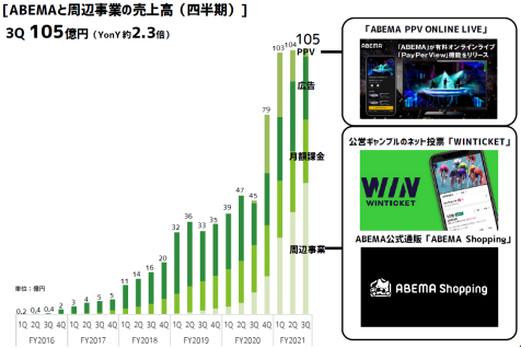 ABEMA及周邊事業三季度銷售額105億日元,該財年內各季度銷售額均同比實現躍式增長。主要增長點有: