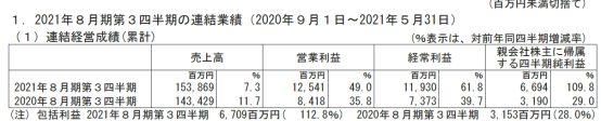 根據USEN-NEXT最新發布的2021年8月期第3季度(2020.9.1-2021.5.31)財報,銷售額1538億6900萬日元,同比增長7.3%;營業利潤125億4100萬日元,同比增長49.0%;經常利潤119億3000萬日元,同比增長61.8%;當期歸屬股東純利潤66億9400萬日元,同比增長109.8%。實現全面增收增益。