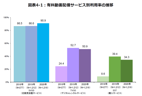 調查顯示,使用收費視頻配信服務的最大原因是「平臺製作的原創作品」,其次是「平臺集齊了自己喜歡的作品種類」「比起租賃DVD更方便」。