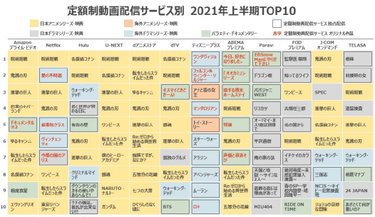 Amazon Prime Video:第一名《咒術回戰》,第二名《鬼滅之刃》,第三名《進擊的巨人》,第四名《約定的夢幻島》,第五名《HITOSHI MATSUMOTO Presents ドキュメンタル》,第六名《搖曳露營△》,第七名《關於我轉生變成史萊姆這檔事》,第八名《名偵探柯南》,第九名《相席食堂》,第十名《EVA新世紀福音戰士》。總體來看Amazon的定額制視頻配信內容仍舊以本土化內容為主,前十中除第五和第九的本土綜藝節目外,其余均為熱門日本動畫。