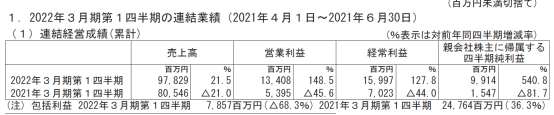 根據日本電視控股公司最新發布的2022年3月期第1季度(2021.4.1-6.30)財報,該季度銷售額978億2900萬日元,同比增長21.5%;營業利潤134億800萬日元,同比增長148.5%;經常利潤159億9700萬日元,同比增長127.8%,歸屬股東當期純利潤99億1400萬日元,同比增長540.8%。實現全面大幅增收增益。