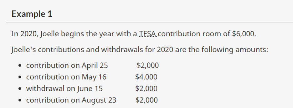 因為你提取出來的額度只能在下一年中使用,而不能在本年再存回去。並且,你TFSA的超額部分是按月計算的,TFSA的罰款是總超額度的1%,也就是説8月份 $6,000超額的部分到年底將會被罰款 $6000 x 1% x 5 = $300的税。