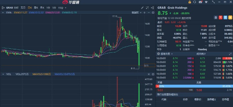 值得注意的是,Grab與「Altimeter Growth達成近400億美元的合併交易,在周四上市首日高開超18%,不過此后Grab盤中「破發」,且大體呈一路下行態勢,最終收盤大跌20.53%,收於8.75美元。