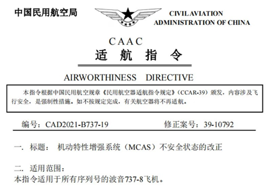 最新發布的適航指令顯示,爲了解決前述不安全狀態,波音啟動了飛行控制系統軟件和顯示系統軟件的設計更改工作,中國民用航空局在對波音提交的飛行控制系統軟件設計更改、顯示系統設計更改、飛機飛行手冊修訂、水平安定面配平線束敷設更改等相關改正措施開展了全面的評估后,確認相關改正措施能夠消除上述不安全狀態。
