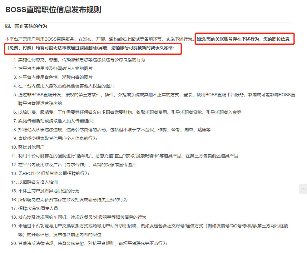 平臺對賬號的監管無可厚非,尤其是在7月,網絡安全審查辦公室對BOSS直聘實施網絡安全審查后。BOSS直聘迴應,高度重視並將積極配合網絡安全審查工作,全面排查和防範網絡安全風險。在《BOSS直聘職位信息發佈規則》中有「如您/您的關聯賬號存在下述行為,您的職位信息(免費、付費)均有可能無法審覈通過或被刪除/屏蔽;您的賬號可能被暫時或永久凍結。」