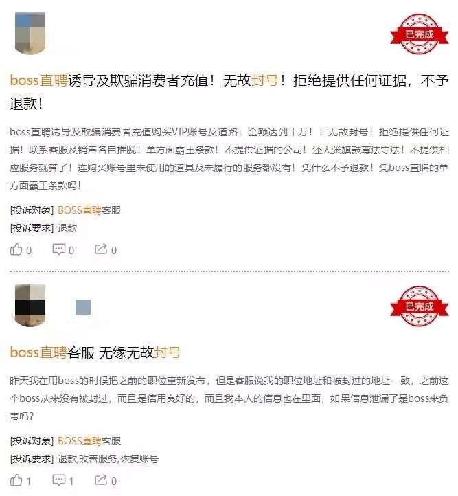 董成對此提出質疑:「在我賬户未違反任何平臺規則、沒有造成任何違規的前提下,BOSS直聘是否有權主動註銷我的賬户?」記者發現,不少招聘者也在新浪黑貓投訴平臺中反饋,「BOSS直聘隨意封號」「賬號被凍結,客服不給解決」等情況。