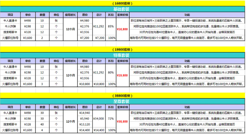 比起前程無憂和獵聘依靠在線招聘服務、校招和培訓等外包服務共同創收,BOSS直聘一直依靠B端,也就是付費企業用户獲得盈利來源,這也許是BOSS直聘的銷售人員大力推銷付費套餐的主要原因之一。