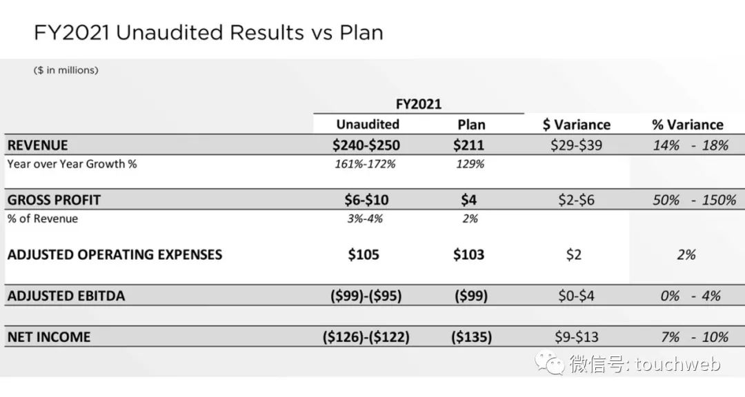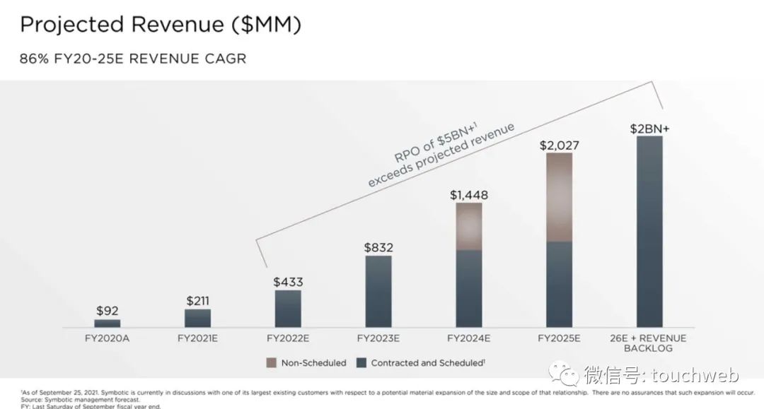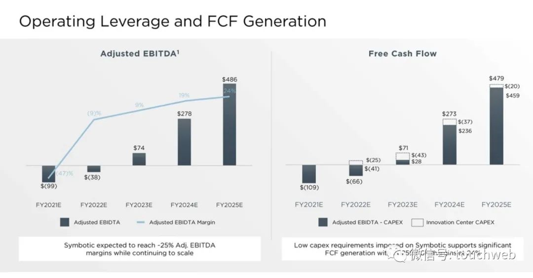 Symbotic預計2021財年營收區間為2.4到2.5億美元,計劃的營收規模為2.11億美元;預計淨虧損為1.22到1.26億美元,規劃中的淨虧損為1.35億美元。