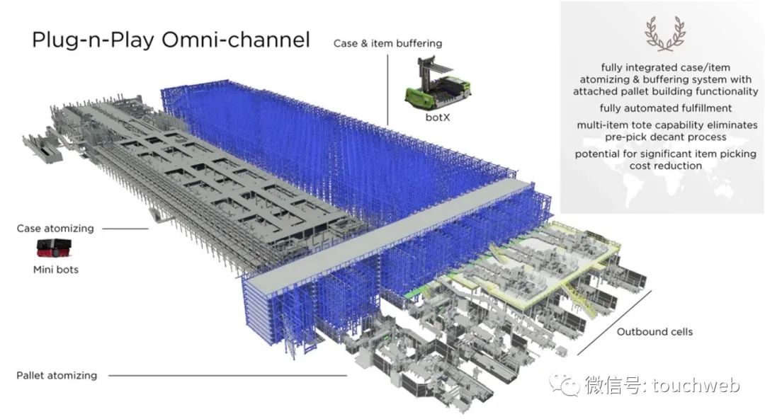 據介紹,Symbotic研發的全自動倉儲系統像個矩陣,里面基本沒有人類存在的空間:一個巨型立方體內是各種鋼架、軌道,機械臂打開托盤,將各種貨品放到傳送帶上入庫,小型機器人在專用軌道上快速移動,把商品放到指定貨架上,有需要時再在算法引導下拿出來發貨。