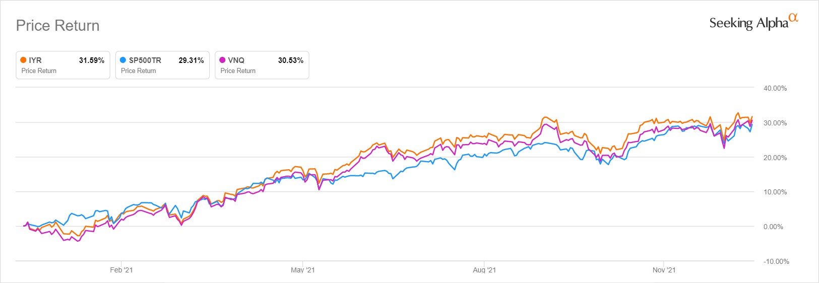 今年以來,美股兩大REIT ETF:房地產指數ETF(IYR.US)與不動產信託指數ETF(VNQ.US)均跑贏標普500指數。但在過去五年中,標普500的總回報率遙遙領先這兩隻REIT ETF。
