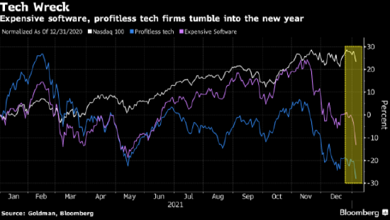 金融危機以來專業投機者最猛烈的拋盤之一,為周三開始蔓延到大盤的科技股砸盤火上澆油。去年12月平倉高增長、高估值股票頭寸的對衝基金猛烈拋售軟件和芯片製造商股票。高盛集團主經紀商業務匯編的數據顯示,在截至周二的四個交易日中,這些賣盤的絕對額達到了10多年來的最高水平。據周三發佈的美聯儲會議紀要顯示,美聯儲表示或更早、更快加息。
