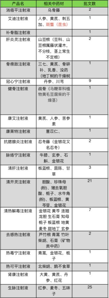 記者對中藥注射液進行梳理,並列出相應的中藥材,其中大部分為中草藥,也不乏地龍(蚯蚓)、水蛭等蟲類藥材。