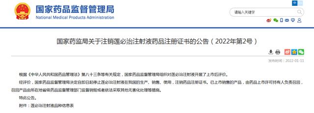 1月11日,國家藥監局宣佈,自即日起停止蓮必治注射液在我國的生產、銷售、使用,註銷藥品註冊證書。已上市銷售的產品,由藥品上市許可持有人負責召回。