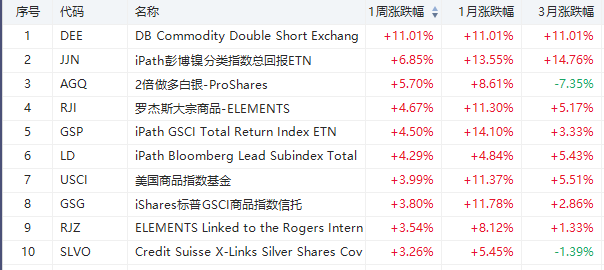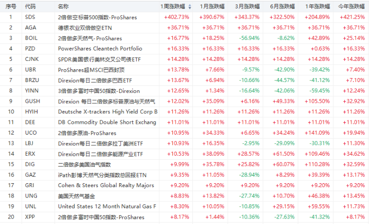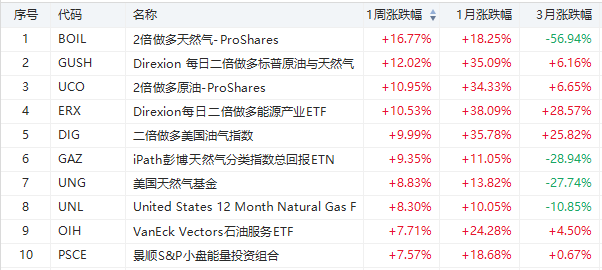 從ETF漲幅榜來看,2倍做多標普原油與天然氣勘探與開採產業的 $GUSH 本周漲超12%,2倍做多原油期貨的 $UCO 和2倍做多能源股的 $ERX 則齊齊漲近11%。