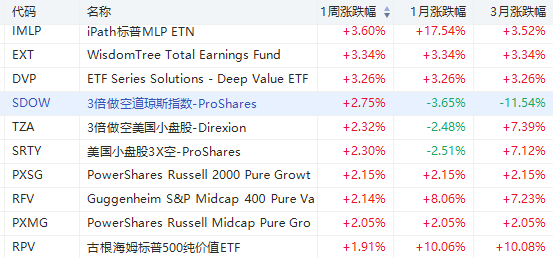 美股股指ETF方面,做空ETF再次成為贏家,其中3倍做空道指的SDOW漲近3%,3倍做空小盤股的TZA漲超2%。由於財報不及預期,本周首批公佈四季度業績的金融股大多下跌,明顯拖垮道指。