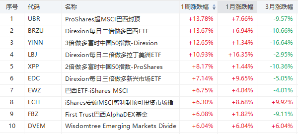 而做多巴西、中國、拉丁美洲的幾隻槓桿ETF也表現出彩,皆錄得超過10%的周漲幅。