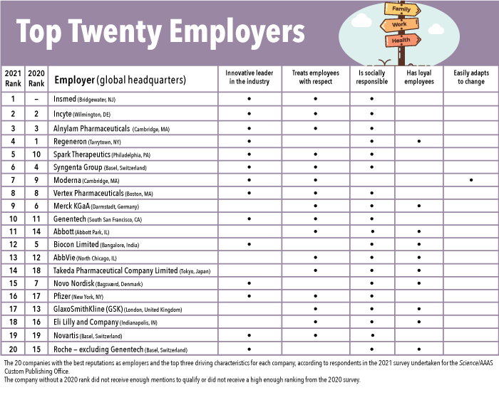 《科學》雜誌2021年度全球生命科學領域最佳僱主排名根據來自全球各地區的相關行業公司僱員、學者和雜誌讀者通過在線調查產生。評價包括在行業里的創新地位(Innovaive ladeer in the industry),對員工的尊重(Treats employees with respect),社會責任(Is socially responsible),員工忠誠度(Has loyal employees),適應變化(Easily adapts to change)等五個方面。本年的調查收到了7225份回覆,其中約51%的人員從事研究或者開發工作。2021年調查的重點關注公司因大流行病而經歷的變化和相關調整,公司如何轉向支持新冠測試以及疫苗開發和推廣。