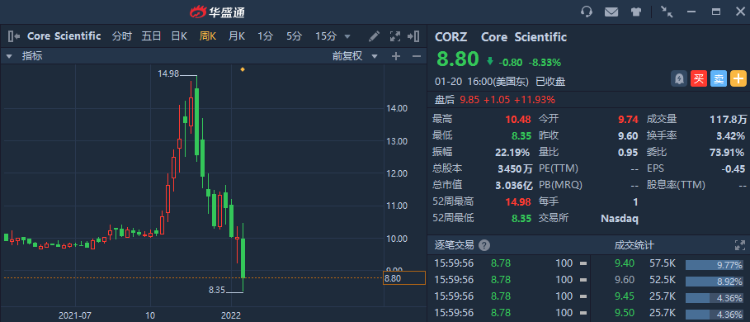 合併后的Core Scientific $CORZ 已於昨日在納斯達克股票市場開始交易,最終收跌約8%,但其盤后又漲近12%。