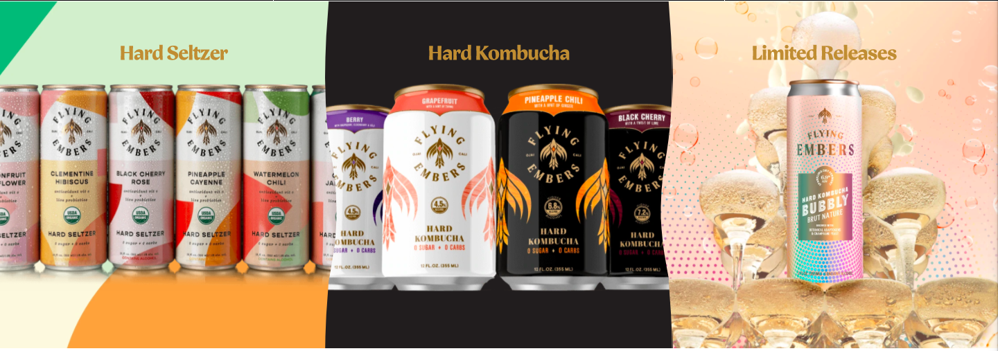 於2017年推出的Flying Embers是一款主打健康有機低度酒理念的酒精飲料品牌,該公司宣稱其含酒精康普茶飲料不僅熱量和糖分很低,不含麩質,同時還包含益生菌飲料的許多健康益處。而對於啤酒愛好者,公司則提供了額外添加啤酒花的飲品選擇。