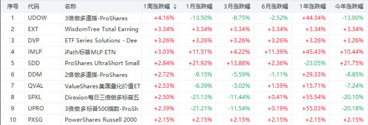 股指ETF方面,本周3倍做多道指-ProShares ETF(UDOW)漲幅居首,一周上漲4.16%,不過今年以來仍下跌了13%。