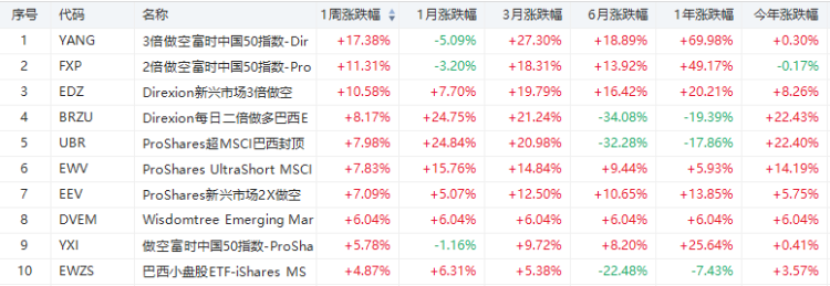 區域ETF中,本周漲幅居首的是3倍做空富時中國50指數-Direxion etf(YANG),一周大漲17.38%。2倍做空富時中國50指數-ProShares ETF(FXP)以及Direxion新興市場3倍做空ETF(EDZ)本周均錄得超10%的漲幅。