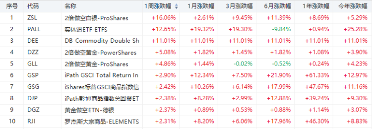 商品ETF方面,本周2倍做空白銀-ProShares ETF(ZSL)漲幅居首,一周大漲16.06%。此外,本周做空黃金的ETF也取得了5%左右的漲幅。