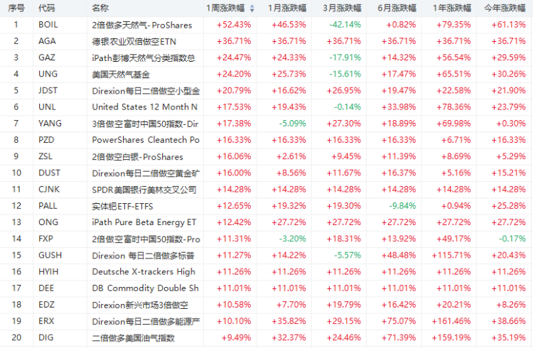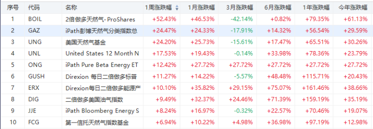 從ETF漲幅榜來看,本周多隻天然氣ETF受市場青睞,其中2倍做多天然氣-ProShares ETF(BOIL)漲幅居首,一周大漲52.43%。消息面上,本周美國2月交割的天然氣期貨價格在合約即將到期前(本周四為交割日)飆漲72%,報6.2650美元/百萬英熱單位,創芝商所自1990年推出天然氣合約以來最高漲幅記錄。