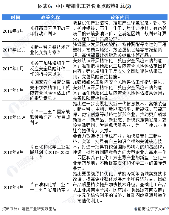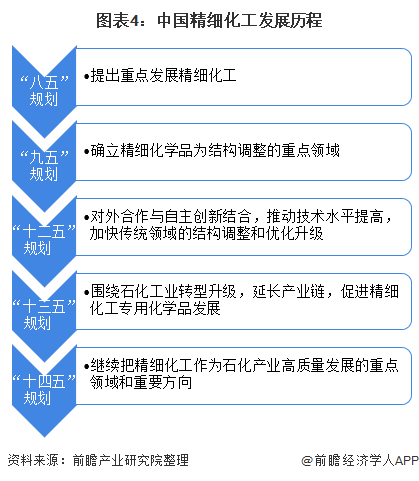 精細化工是石化產業的重要組成部分。中國精細化工行業起步較晚,「八五」規劃提出重點發展精細化工,「九五」確立精細化學品為結構調整的重點領域,而「十二五」規劃期間,受到關鍵技術的制約,國內精細化工和新材料方面發展較為緩慢,基於此發展背景,「十二五」規劃明確指出,精細化工行業應積極技術創新,大力生產環境良好型產品和高附加值的化工新材料,以求縮短與發達國家在技術水平上的差距。而到了「十三五」期間,精細化工行業的發展主題變成圍繞石化工業轉型升級,依據各省市原有產業基礎因地制宜,以建設國家重要的戰略性石化產業基地為目標,進一步擴大油氣加工、乙烯生產、新型煤化工等生產規模,延伸產業鏈條,促進石油化工與煤化工產業耦合發展。