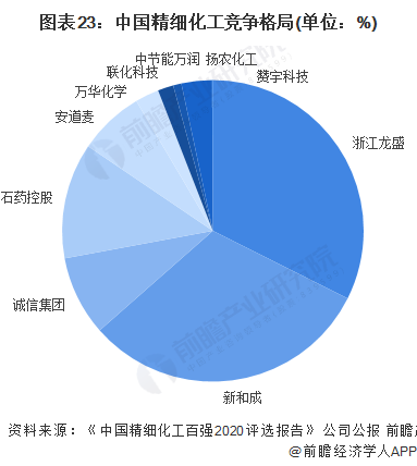 根據《中國精細化工百強2020評選報告》數據對企業精細化工主營業務進行匯總分析,中國精細化工行業市場集中度低,CR10僅為約12%,其中浙江龍盛集團股份有限公司位居榜首,浙江新和成股份有限公司和河北誠信集團分列二三位,營收佔比分別約為4%和1%。表明中國精細化工行業整體市場集中度低,且從一定程度上説明,企業無法形成核心競爭力優勢,即產品同質化較為嚴重。結合上述細分子行業研究分析數據,初步判斷細分市場間競爭程度激烈且行業內產品同質化問題較嚴重。