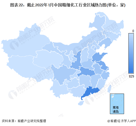 根據2022年1月17日,企查查搜索關鍵詞「精細化工」,選擇存續在業的精細化工企業得到5643家註冊資本100萬以上的生產企業,其中廣東省分佈最多。