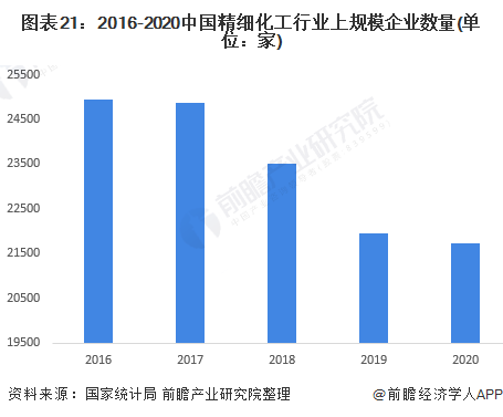 2016-2020年,中國精細化工行業企業數量逐年下降。2020年企業數量進一步下降,規模達到21722家。表明近五年來受整體經濟環境下行與化工行業相關環保政策收緊的影響,中國精細化工行業參與熱情有所下降,行業內橫向整合趨勢明顯。