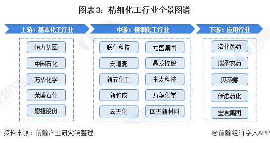 而精細化工行業上游以中國石化、恩捷股份、榮盛石化等傳統石化企業為主,市場集中度高,份額供給較為穩定;中游為精細化工製造企業,專業性強化,細分程度較高,比如新和成主營醫藥精細化工產品,聯化科技以農藥精細化工產品為主;下游行業主要是成品領域經營商,比如寶潔日化、浩業醫藥等。