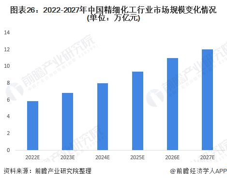 根據Marketupdate發佈的《2021全球精細化工品市場報告》,Marketupdate預測全球精細化學品市場將以相當大的速度增長。亞太地區將在未來幾年佔據更多的市場份額,特別是在中國地區,預計未來行業年複合增長率將超過全球精化行業年複合增長率。且結合中國化工協會2019年對於精細化工行業2021年總產值的預測,初步估算,2022-2027年中國精細化工行業市場規模逐年上升,且2027年市場規模有望超過11萬億元。