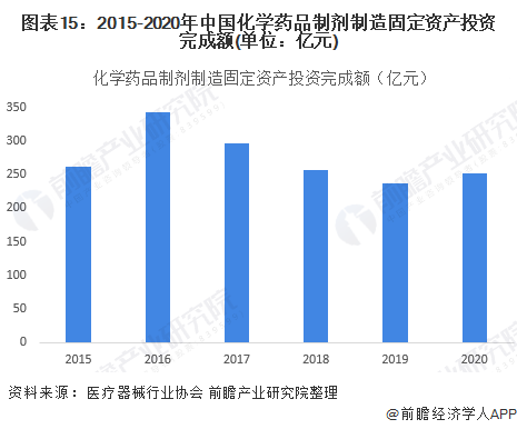2015-2020年中國化學藥品製劑製造固定資產投資完成額呈現波動變化趨勢,且波動範圍為200-350億元。2020年固定投資完成額達到252萬元左右,同比增長約11%,結合化學制劑行業不斷上漲的需求空間來看,化學制劑行業處於上升周期,預計未來行業市場規模將進一步上升。