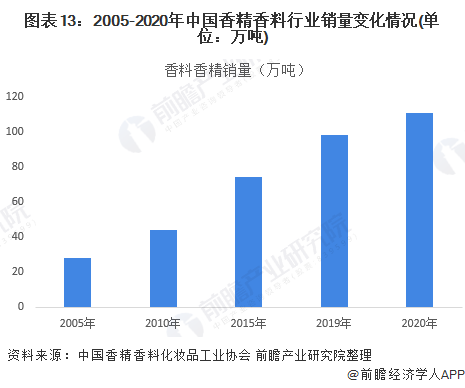 2005-2020年,中國香精香料行業銷量逐年上升。2020年,中國香精香料銷量超過110萬噸,同比增長13%。由於國內市場發展較晚,供需遠未達到飽和狀態,因此,未來中國香精香料市場有較大上升空間。