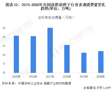 2015-2020年,中國塗料染料行業表觀消費量波動下降。2020年,中國塗料染料表觀消費量超過19.5萬噸,同比增長2%。近兩年表觀消費量進一步下降的主要原因是各種隔離措施使市場消費出現斷崖式下滑,終端企業大量停產或開工推迟;而疫情過后,下游需求市場逐漸復甦,2020年塗染料的表觀消費量相應出現輕微上漲。
